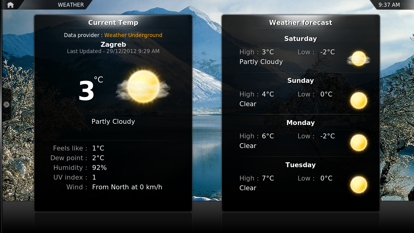 Za početak, vremenska prognoza mi govori da vani pada kiša i da mogu slobodno uživati u svom multimedijskom centru (danas to nije tako ali nema veze). Čak je i meni bilo jednostavno podesiti vremensku zonu i dobio sam na ekranu upravo ono što sam ranije pokušavao sa raznim screenletsima, weather indicatorima… Sučelje kakvo bih i sam volio napraviti, kada bih znao. XBMC je odradio to za mene.