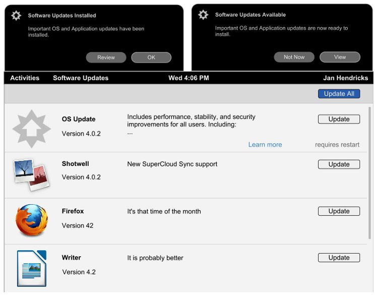Gnome developeri planiraju promjeniti to i natjerati nas da ponovno pokrenemo računalo kod svake nadogradnje čime bi se bitno smanjila vjerojatnost od mogućeg kvara sustava. Ovo nas ipak podsjeća na nadograđivanje na Windows sustavima kojega moramo ponovno pokretati kod svake nadogradnje sustava, pa je izgledno da ćemo morati ponoviti onu staru: “Rugala se sova sjenici..”. Uglavnom, gnome-settings-daemon će surađivati s PackageKitom, i skinuti sve potrebne nadogradnje i pripremiti /var/lib/PackageKit/prepared-update datoteku za nadogradnju. Nakon toga dobivamo obavijest “Ponovno pokreni računalo i instaliraj nadogradnje”, i ukoliko na nju kliknemo pokreće se pkexec pk-trigger-offline-update koji kreira /system-update a sesija se ponovno pokreće. Kod sljedećeg pokretanja PackageKit priprema nadogradnju i instalira sve pakete, a nakon toga obavještava korisnika dali je nadogradnja uspjela ili ne.
