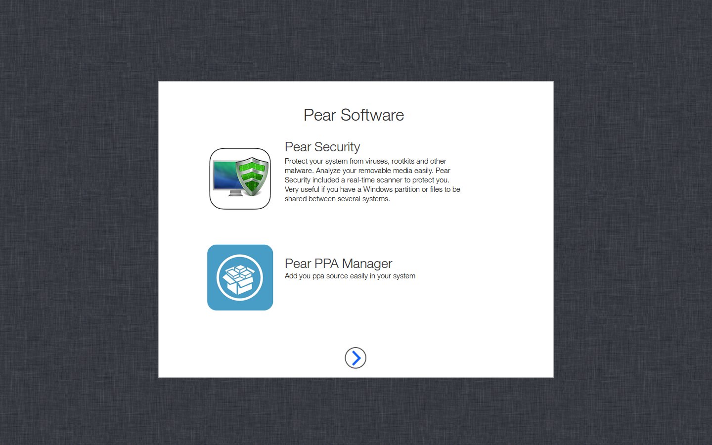 Osim Pear Desktopa dočekuje nas i još jedan raritet kojeg sam sve rjeđe viđao u drugim Linux distribucijama; Pear uvodnik, odnosno nekoliko stranica vizualno lijepog sadržaja koji korisnika “upoznaje” s Pear OS-om. Tu su ukratko opisani neki od programa, njihova funkcija i način rada s prozorima, zapravo brze upute kako funkcionira desktop. Iskusnijim korisnicima će ovo možda malo zasmetati, ali treba imati na umu da je ovo sistem koji cilja na jednostavnost upotrebe i na one bez puno iskustva s Linux desktopom. Uglavnom, stvar o kojoj bi mogle razmisliti i neke puno razvikanije user-friendly distribucije.