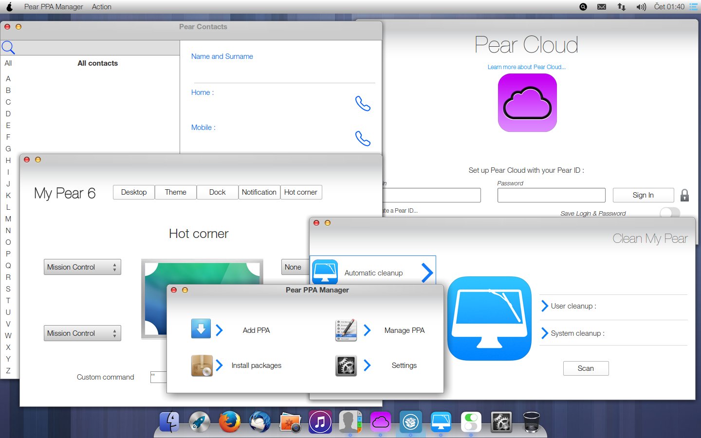 Pear OS 8 ne dolazi s puno toga, ali to je već tradicija. Osnovne stvari su tu, a na korisniku je da si naknadno instalira što mu treba. Tu su tek sistemski alati, nešto accessoriesa i naravno Pear programi. Za razliku od mnogih drugih koji samo ubace u distribuciju neke programe, ovdje je slučaj malo drukčiji. Naime, korisnički i sistemski programi koje Pear OS isporučuje out of box su funkcionalno prerađeni i grafički dotjerani, tako da su uklopljeni u sam OS i jako doprinose ukupnom iskustvu korištenja. U specifične i prilagođene programe tako spadaju: My Pear6, Clean My Pear, Pear PPA Manager, Pear Sistem Info, te Pear Updater. Također, tu je i Pear Contacts koja je potpuno nova aplikacija u Pear Os-u. Još valja izdvojiti i Pear Cloud – Pear verziju Ubuntuovog Ubuntu Onea. No, kako se sve prilično odužilo, neću ih posebno recenzirati već ostavljam budućim korisnicima da se s njima upoznaju. Možda još da dodam da mi je žao što je u ovom izdanju izostavljen Pear Time Back, pojednostavljeni program za backup na bazi gnomeovog Back In Time alata, mislim da bi tada užitak bio potpun, ali što je – tu je!