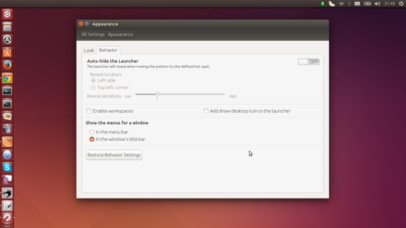 Na istoj slici mogu se vidjeti i dvije estetske nadogradnje: uklonjen je “rub” sa prozora i zaglađeni su (antialiased) kutovi prozora. Mali detalji, ali čine Unity mrvicu ljepšim i ugodnijim za korištenje. Integrirane izbornike moguće je uključiti kroz System Settings – Appearance – Behavior.